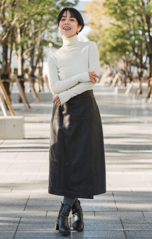 またレザーロングスカートを加えるだけで、コーディネートがまとまるお助けアイテムなのです。