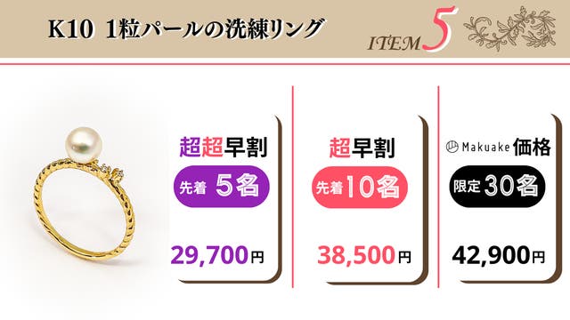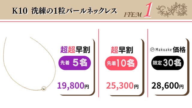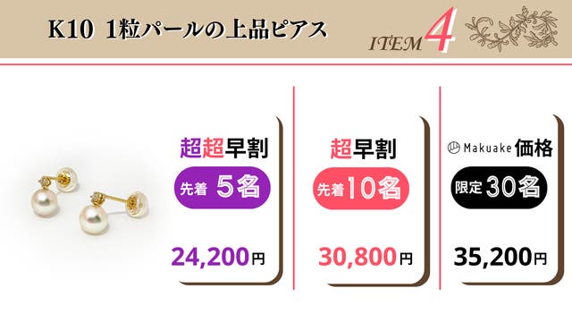 ・真珠には個体差がございますのであらかじめご了承下さい。 ・パール製品は接着を伴った留め方です。過度な力がかからないようにお気をつけ下さい。 ・大切なジュエリーを長くご愛用頂く為にご使用後は柔らかい布でのふき取りをお勧めします。 ・ご使用後は、別のジュエリーに触れないように1点ずつケースなどに入れて保管して下さい。 ・家事、スポーツ、入浴、就寝などでのご使用は、破損や不具合の原因になりますのでご注意下さい。 ・体質によってかゆみ、かぶれを生じる場合がございますので異常を感じた時はご使用をお止めいただき専門医へご相談して下さい。 本文中に記載させていただいたスケジュールは、あくまでプロジェクト公開時点の予定です。 応援購入の性質上、配送遅延のおそれがございます。 原則として、配送遅延に伴う応援購入のキャンセルはできませんが、リターン配送予定月から3ヶ月を超えた場合には、希望者に限りキャンセルにて対応させていただきます。