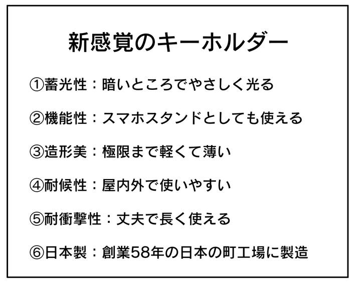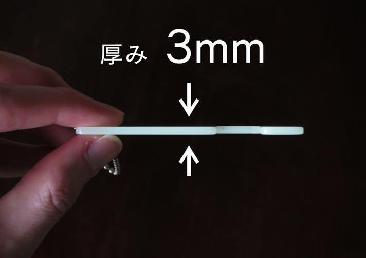 このキーホルダーの厚みは、わずか3mm。重さも5gしかないので、持ち運びもしやすくなっております。一般的なキーホルダーに見られる、分厚さや重たさがありません。シンプルで美しさを追求したデザインになっております。