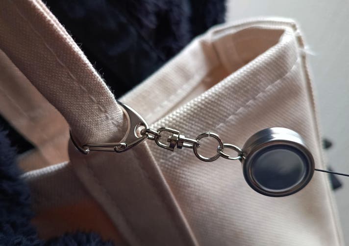 付属のリールキーホルダーは、引っ張ると簡単に伸び、最大42cmまで伸縮します。手を離すと自動で元に戻るため、スムーズに使用できます。パスケースを取り付ければ、改札などでそのまま伸ばしてタッチできるので、利便性が向上します。