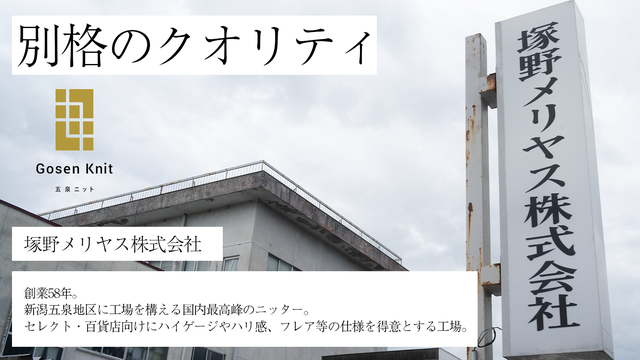 国内有名ニットファクトリーの集積地五泉市、その中でも最上質なニット製品を創り続けている塚野メリヤスが手掛けたハイゲージニットの生産ストーリーに迫っていきます。