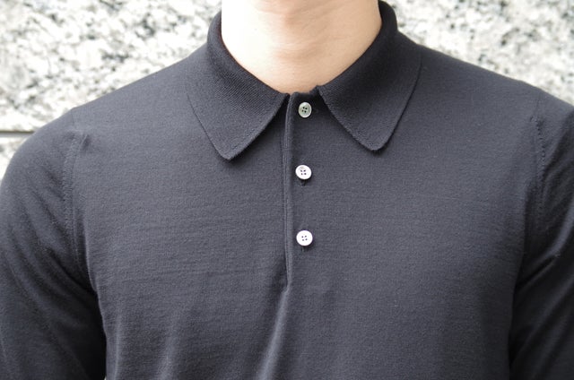 アームホール、襟先にも目立てを入れる事で丁寧で美しい仕様に。また襟元は身頃よりも肉厚な組織で編立てているため、皺やヨレを防ぎ、きちんと感を演出。釦は天然の黒蝶貝・茶蝶貝を使用。