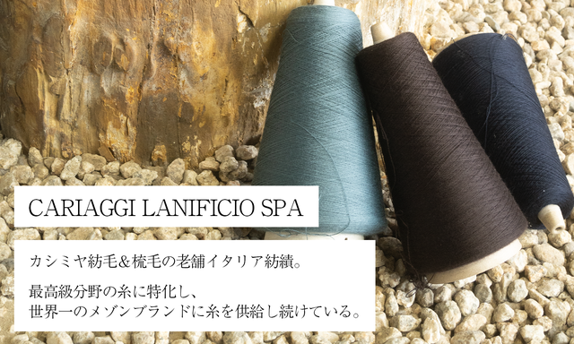 1958年創業 イタリアマルケ州に本社を置くCARIAGGI社が世界に誇る、スーパーヤーンが今回のプロジェクトで使用する「2/60 ANTILOPE」 (100 % EXTRAFINE MERINO SUPERIOR WOOL)