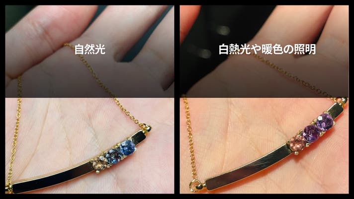 カラーチェンジストーンの魅力は、光の違いによって驚くほど表情を変えること。