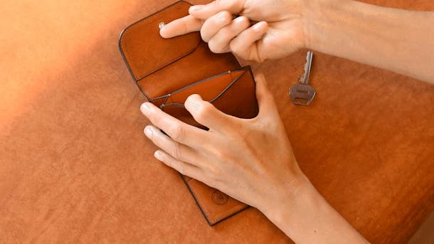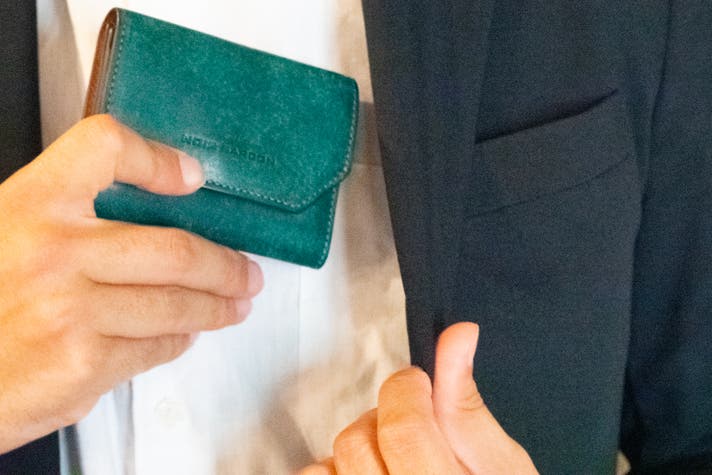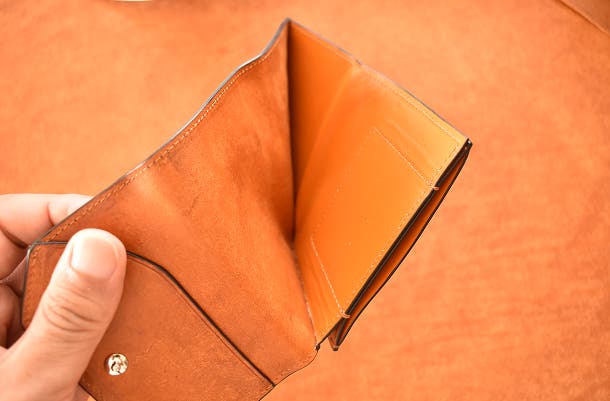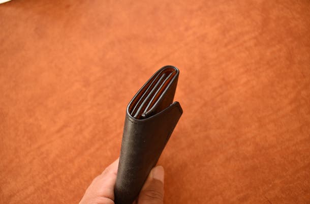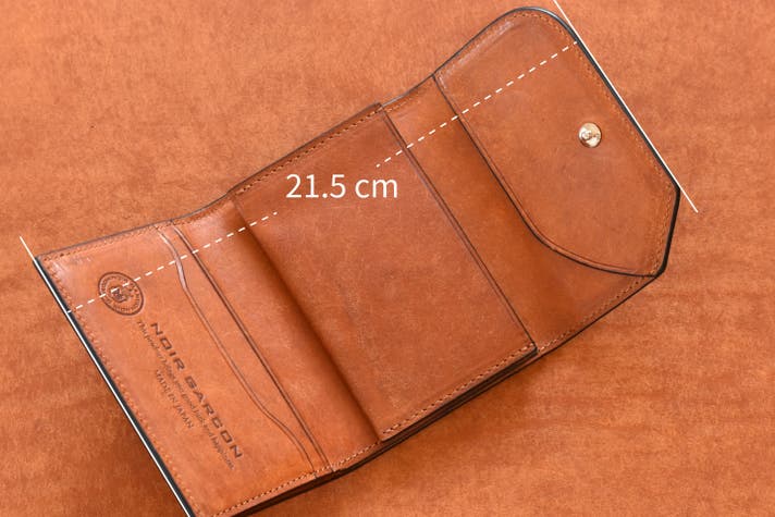 カードポケットの縁には、手のひらで軽く押し引きするだけでスムーズにカードが取り出せる“えぐり”加工を施しています。ポケットの開口部に沿って緩やかなカーブを描くように革を削ぎ落とし、角度と深さをミリ単位で計算。実際の操作感を何度も検証しながら、指先がしっかり引っかかる最適な傾斜に仕上げました。このこだわりのカーブ設計により、会計や改札など日常のあらゆるシーンでストレスなくカードを出し入れできます。他社では職人の手間や技術的な負担を考慮し、カード段は直線的な形状で簡略化して製造されることが多いです。弊社では、あえて手間のかかる曲線構造を採用し、職人の高度な技術を活かした丁寧な仕立てを実現しております。