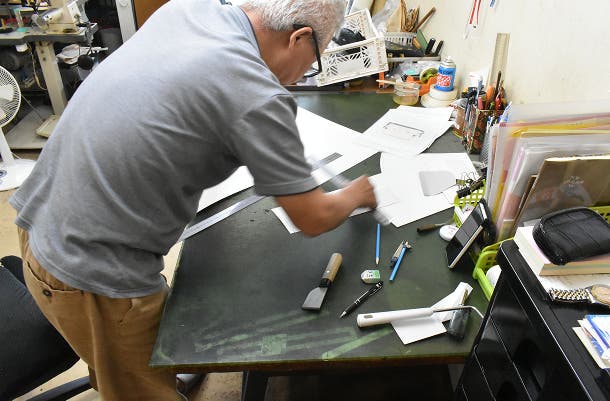 財布の美しいラインと使いやすさを左右するのが「型紙」です。経験豊富な職人がミリ単位で調整を繰り返し、無駄を削ぎ落とした精緻な設計によって、革本来の質感を引き立てる構造を生み出しました。