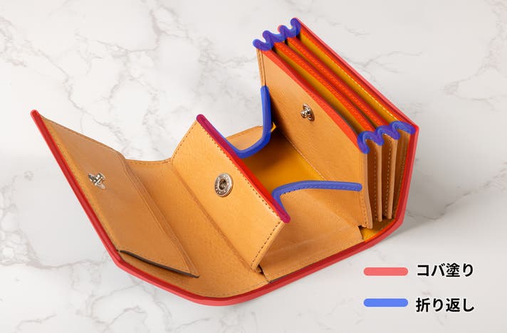 一方で、コインポケット周りや蛇腹(じゃばら)部分のように、曲がる動作が多い箇所は「折り返し」の技法を採用。