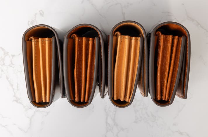 この硬さこそが、三つ折り財布に必要な骨格となり、輪郭を保ち、型崩れを抑えます。