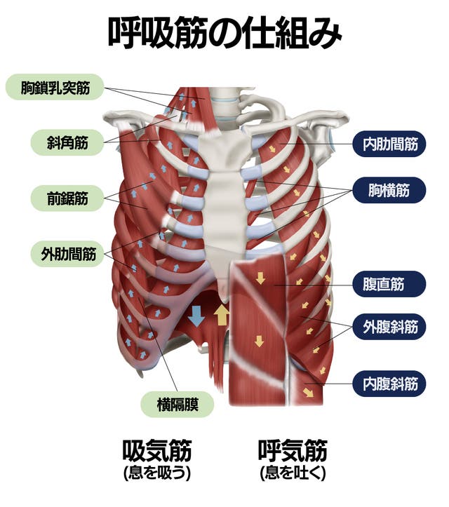 呼吸は肺を動かせる筋肉である横隔膜を中心に「吸気筋」と「呼気筋」と呼ばれる筋肉の収縮&弛緩によってできます。