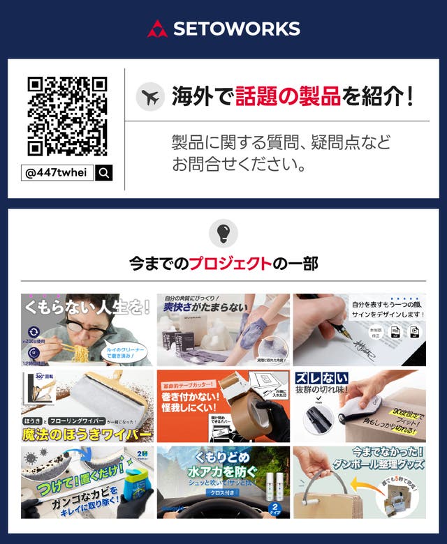 setoworksは日本の新しい製品を外国にいち早く紹介する事業を始め、海外の新しい商品や直接企画した多様なプロダクト製品を日本国内に紹介する事業を展開しています。たくさんの応援の程よろしくお願い致します。