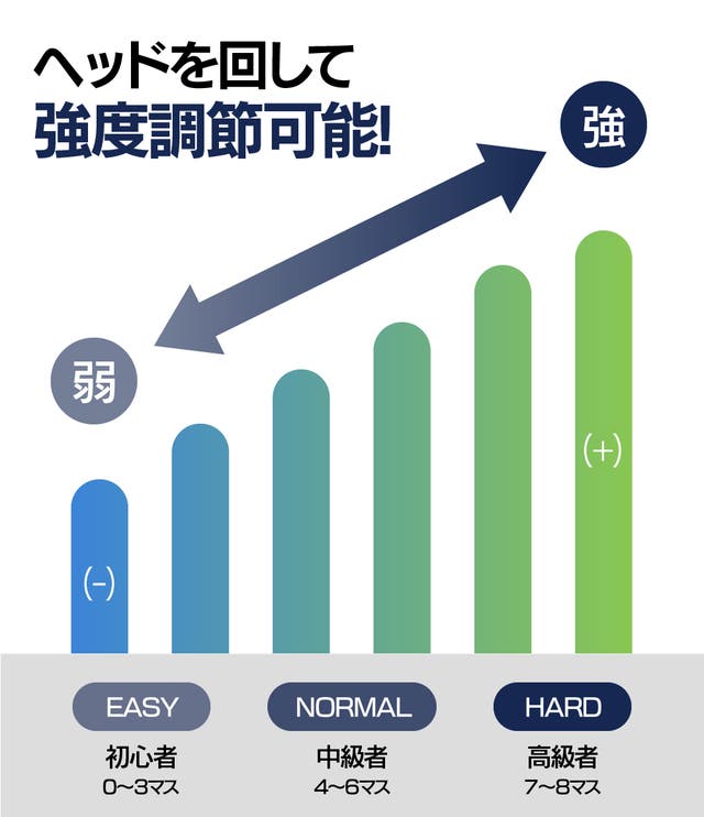 ノイストップはダイヤル式調整方式を採用し、(-)の方に行けばEASYモード、(+)の方に行けば行くほどHARDモードで使用できます。