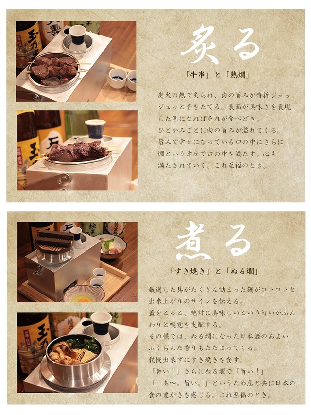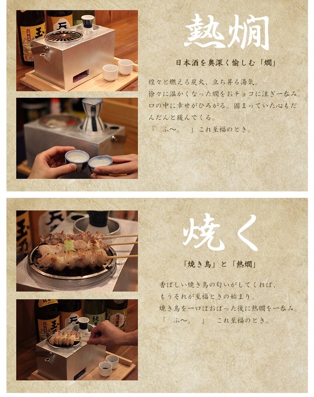 炭火の煌々とした美しさ、静かに立ち上る湯気、そして温かくなる熱燗。野燗炉で愉しむあなただけの「至福の時」。それは自分自身の心を開放する時間。