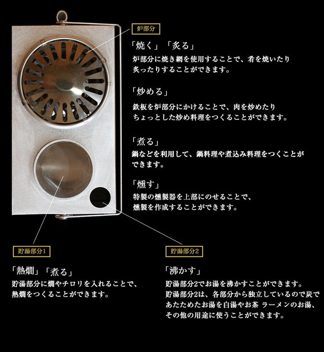 ②貯湯部分1を使って、汁もの料理(ラーメン・スープ・味噌汁等)を調理出来ることにより「炉部分」と同時に調理出来ます。