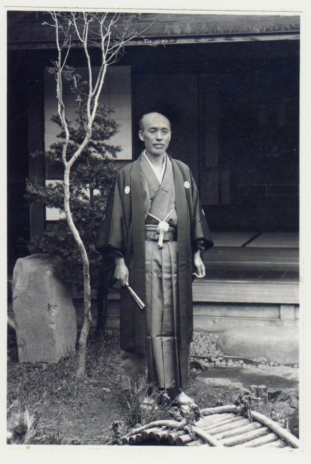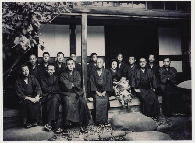 ▲初代・泰蔵を囲んで、家族、従業員と中庭で