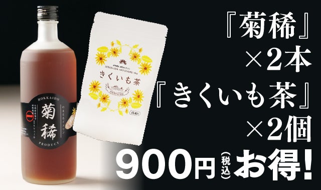 今回は、この『菊稀』単品に加えて、きくいも茶とのセットや、北海道オホーツク海産乾燥ホタテ貝柱とのセットもお得な割引価格で用意しました。