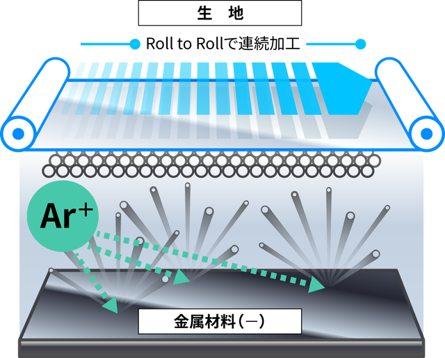 スパッタリング加工とも呼ばれるこの技術は金属をナノレベルで付着させる事で生地の風合いを損なう事無く、金属の持つ効果、効能を付与出来る事が特徴です。