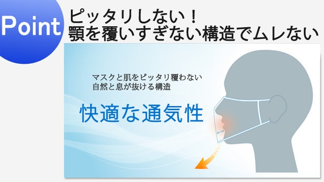- ピッタリしない!顎を覆い過ぎず、息が抜けやすい構造で、マスク内が蒸れない!