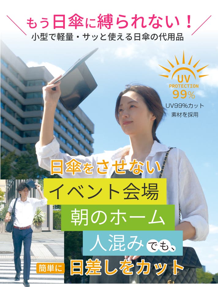 紫外線対策は、これで解決?!ノンブレラは特殊なUVカット加工を施した、紫外線を99%遮断する素材を採用しています。駅のホームや人混みなど、日傘をさせない場所でもサッと手軽に日よけが可能です。長時間の外出や強い日差しの下でも肌をしっかり守り、日焼け止めを塗り直す手間を軽減。汗をかいても安心で、ちょっとした日差しを効果的にブロックできる、新しい日よけアイテムです。