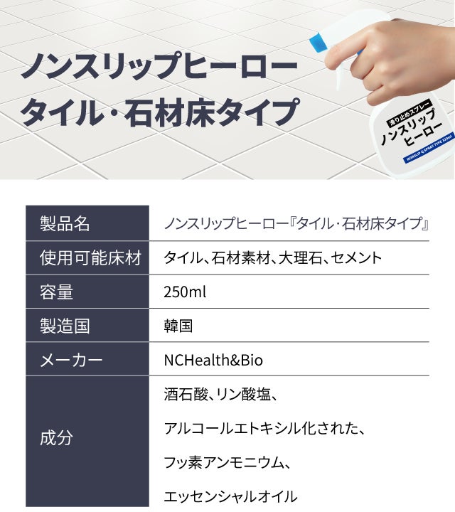 ノンスリップヒーローはこのような悩みを解決するため、あらゆる床で使えるタイプ、特に水気の多い浴室タイル床などで活躍できるタイル石材タイプをご用意しました。