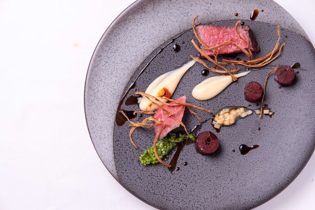 山葵の爽やかさとピリっとした辛味が松阪牛の脂と藁の燻製香をより官能的に感じさせ、巨峰のタンニンが生姜のラグーと牛蒡のポワブラードを包み込み肉への激しいアプローチを奮い立たせます。