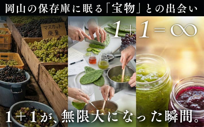 岡山の恵みを、未来へつなぐ「循環」のカタチ 贈答用のシャインマスカットやピオーネが収穫される岡山。その裏側で、味は一級品ながら房から外れてしまっただけで廃棄されてしまう「端材」があることを知りました。この「もったいない」を、世界の食糧危機を救うとされるサステナブル食材「サボテン(ノパル)」の知恵と掛け合わせたい。その想いから、今回のプロジェクトは動き出しました。