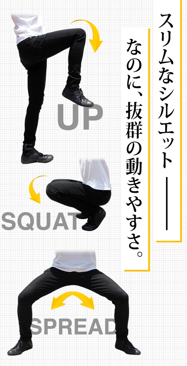 スキニータイプと同じくあらゆる場面で着用、そして活躍できるスリムチノタイプ。ポケット周りのディティールもこだわり、チノパン風のパターンに設計しました。スキニータイプより“少し余裕が欲しい”と思われる方にはスリムチノタイプがおすすめです。同じく伸縮性抜群の生地を使用しているため、快適な履き心地を体感いただけます。
