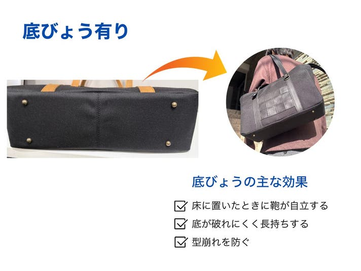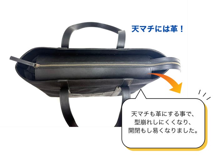 バッグ全体を硬くせず、必要な部分にだけ芯材を入れています。