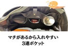 反対側に「ワイドポケット+3連ポケット」。