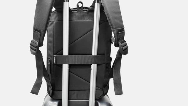 バックパックを荷物の引き出し用の行李ラック固定ベルトでスーツケースに固定し、肩の負担を軽減します。 パスポートや重要な証明書類は背面の防犯ポケットに保管し、安全を確保します。