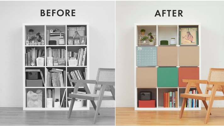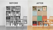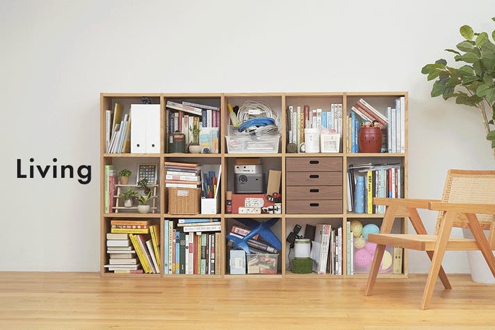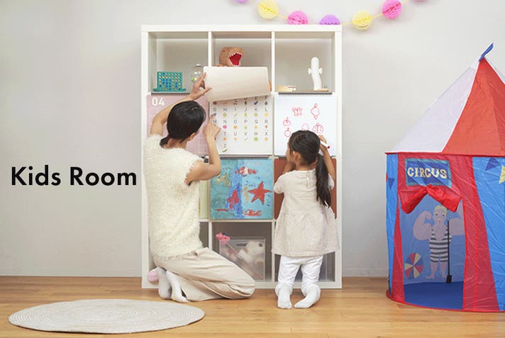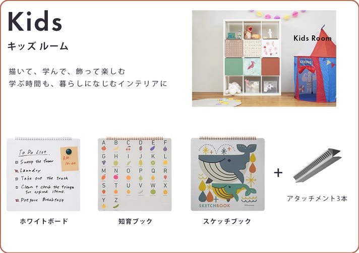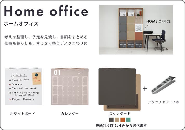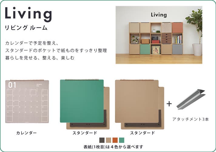冊子を「カチッ」と簡単に取付けることで、本棚のごちゃごちゃを隠して、空間を整えると同時に、そこがポケット収納やホワイトボード、カレンダーなど機能を持ったディスプレイへと変わります。