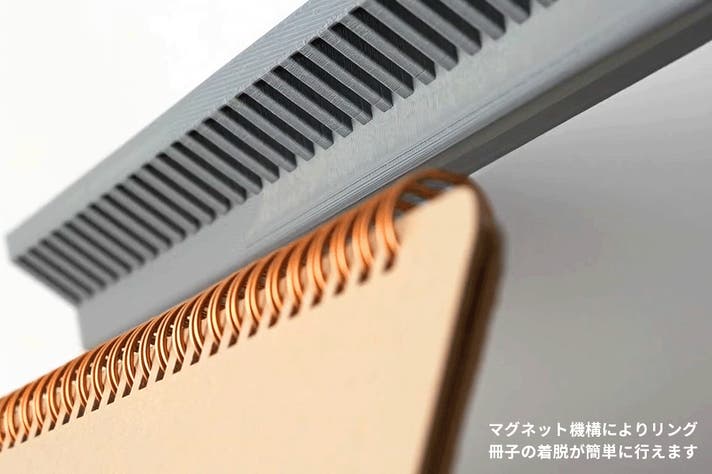 ②「カチッ」と簡単に冊子を取り付けることが出来ます。マグネット構造により、簡単に着脱が可能です。