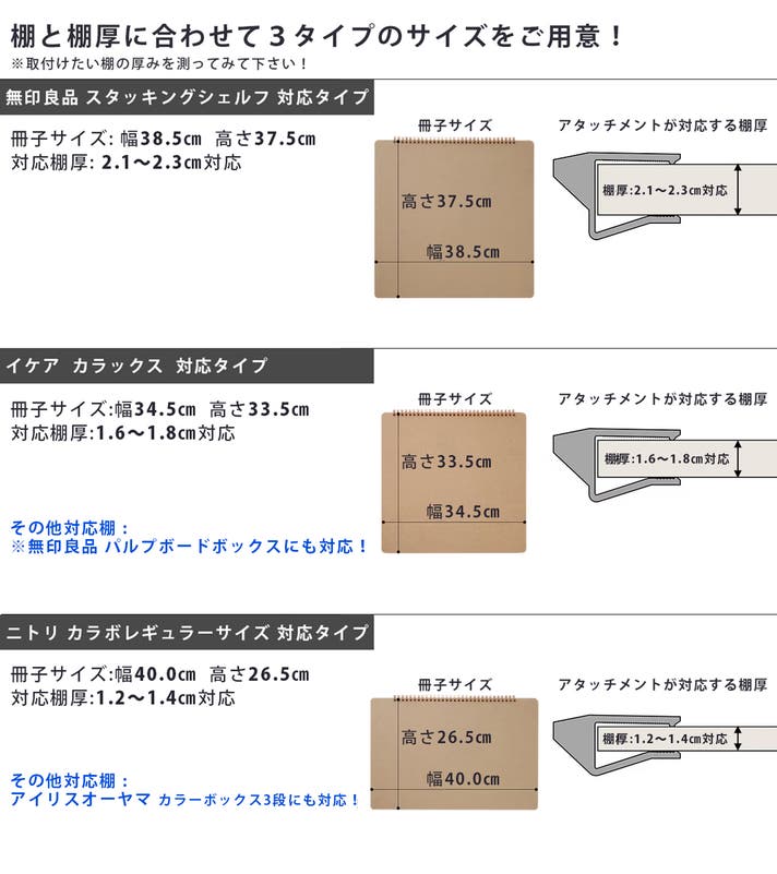 A. 無印良品・イケア・ニトリ・アイリスオーヤマなどの一般的な本棚に対応しています。ご使用の棚板の厚みをお確かめのうえ、詳しい対応サイズは商品ページ内の図をご覧ください。