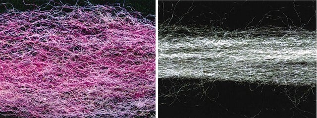 上はスライバー(撚りをかける前の糸の原型)で比べた写真です。NORO Yarnは繊維1本1本にゆとりがあり、配列が不規則になります。独特の光沢やかさ高性が生まれます。