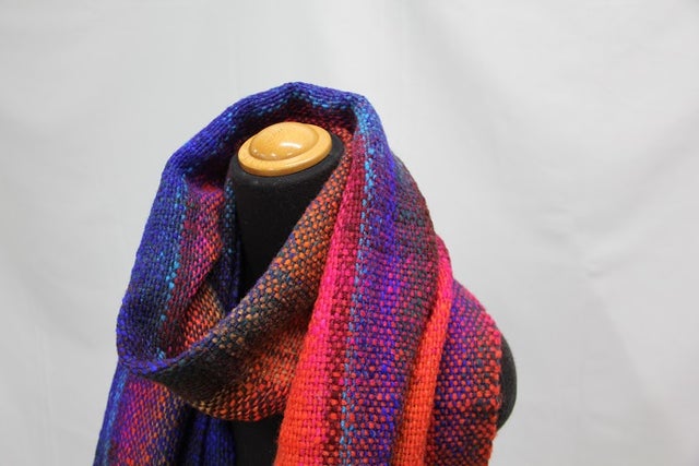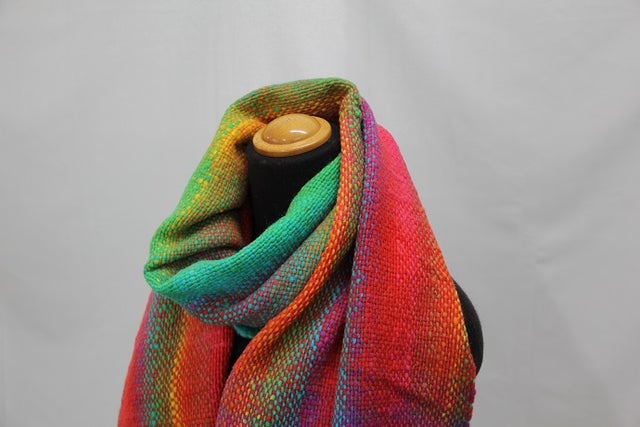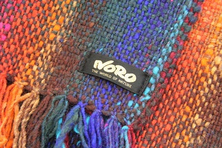 NORO Yarnは10~15色もの色が長いピッチで混ざり合いながら変化していく華やかな糸です。織り始める色によって全体の配色が1枚1枚異なります。