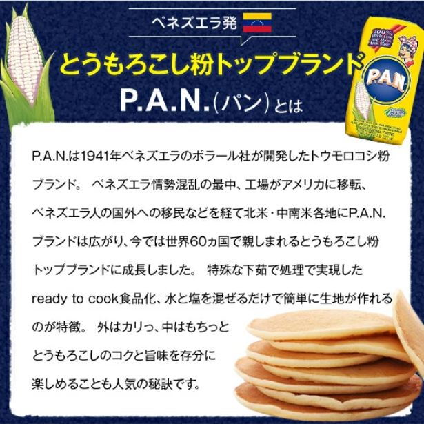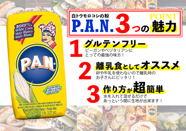 さらに今回はリターンに生地の材料として白とうもろこし粉の「P.A.N」をご用意いたしました!「P.A.N(パン)」にはたっぷり1kgの白とうもろこし粉が入っています。