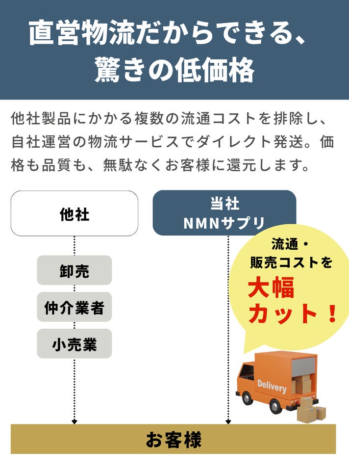 その結果、保管や配送にかかるコストを大幅に削減することができ、NMNサプリメントの原価率をできる限り高めながら、高品質かつ、お手頃な価格を実現しました。