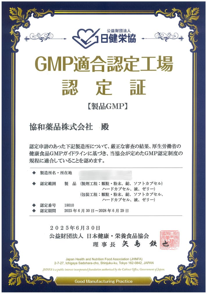 GMP認定工場で製造された製品は、「安全性」「有効性」「一貫した品質」が保証されており安心して毎日続けられるサプリメントを実現しています。