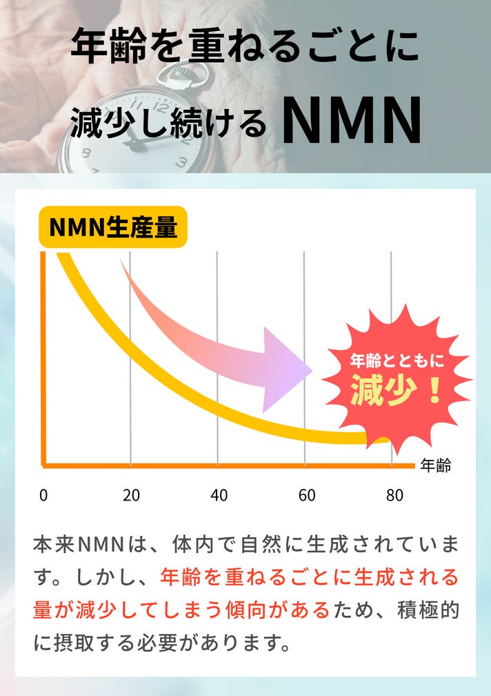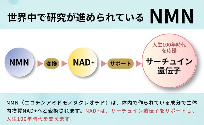 NMN(ニコチンアミド・モノヌクレオチド)は、体内で「NAD+」というエネルギー源に変わり、サーチュイン遺伝子を活性化させる成分と言われています。