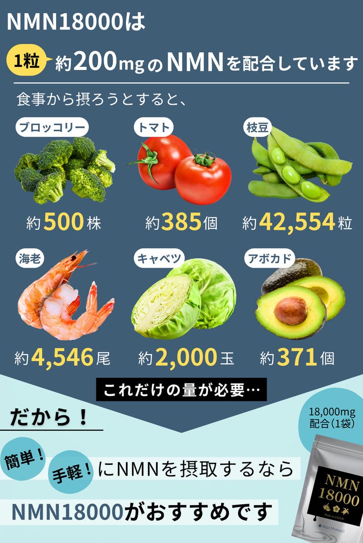 【原材料名】β-NMN(国内製造)、うめエキス末、シジミエキス末、コエンザイムQ10、赤ワインエキス末、PQQ、すっぽん粉末、黒にんにく粉末、黒酢もろみ粉末/セルロース、HPMC、ステアリン酸カルシウム、ビタミンC、ビタミンD