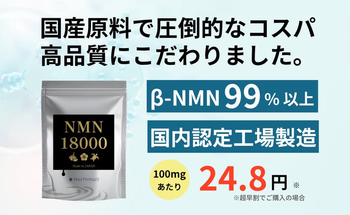 製造はGMP(適正製造規範)認定工場で行われ、β-NMN純度99%以上で精製。