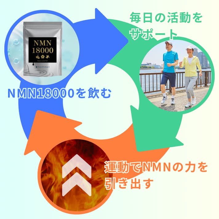 「飲む → 毎日の活動をサポート → 運動でNMNの力を引き出す」