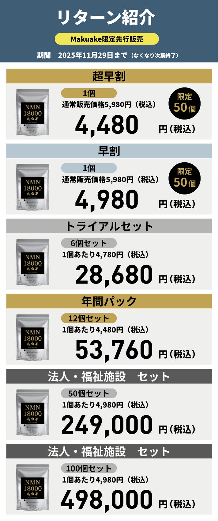 「Makuake(マクアケ)」は、実行者の想いを応援購入によって実現するアタラシイものやサービスのプラットフォームです。このページは、 プロダクトカテゴリの 「圧倒的コスパで健康習慣を手軽に。高品質国産NMN×純国産素材のサプリメント」プロジェクト詳細ページです。