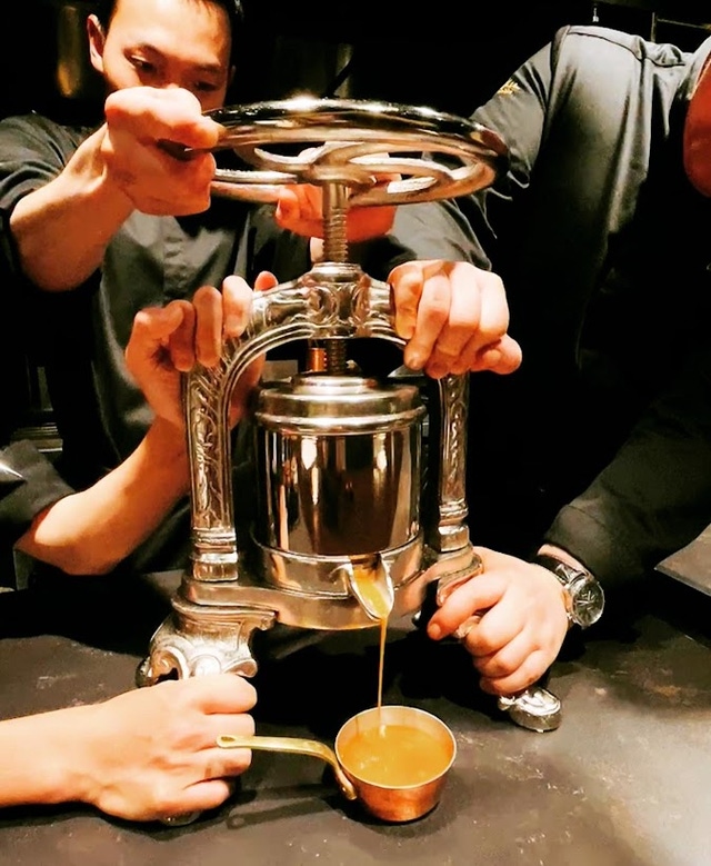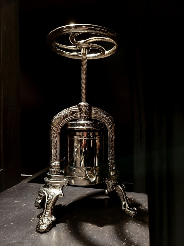 1800年代後半に登場した調理器具「ダックプレス」。その名の通り、鴨のガラをプレスして旨味あふれる「ジュ」を絞りだす器具。このジュから実に美味しいソースが作られるのです。当店では1900年代初頭にフランスのレストランで実際に使われていた、アンティーク「ダックプレス」がカウンター奥に鎮座しています。メッキし直しさらに存在感増したこのダックプレスがコースのどこで登場するかはお楽しみ!