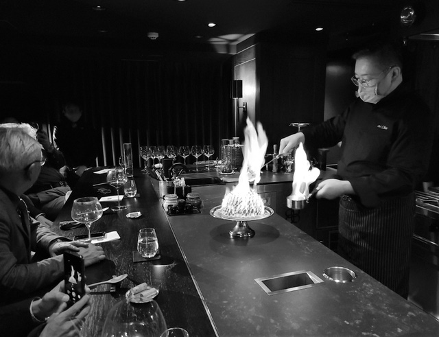100年以上前にフランスのレストランで実際に使用されていたアンティークの「ダックプレス」が鎮座し、カウンターの端には最新のオイルバスや炭焼き台が設置されるなど、調理過程が手の届く距離で見え、高揚感が止まりません。