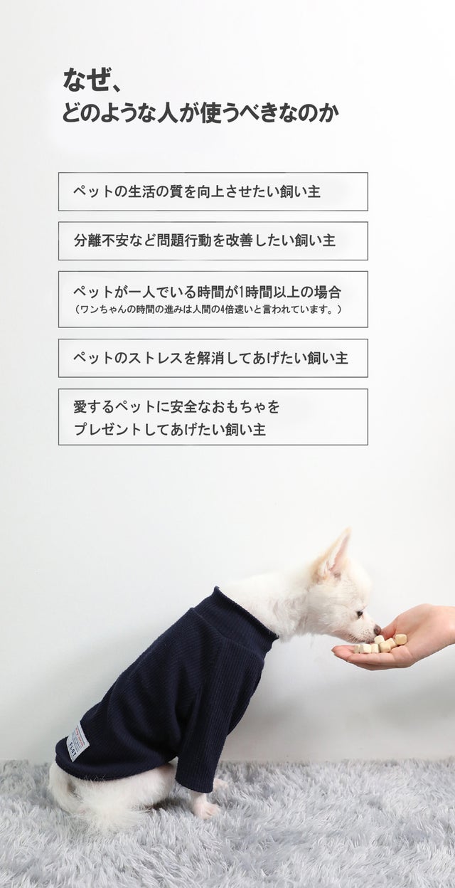 忙しい現代人は、ワンちゃんを一人で家に残していくことが多くあります。特に一人で暮らしている人やサラリーマンなど働く人と暮らすワンちゃんは、日中ほとんどの時間を一人でワンちゃんたちは大好きな飼い主の帰りを待ちながら孤独にお留守番をしています。あなたがいないとき、ワンちゃんたちはどのように過ごしているのでしょうか?やむを得ず発生するお留守番により、ワンちゃんたちは孤独、疲労を感じているかも。この製品は、一人でいる時間にワンちゃんたちに申し訳ないという飼い主の思い、さらにをワンちゃんが吠えること、不安な気持ちを感じているワンちゃんの相手をすることができる製品です。