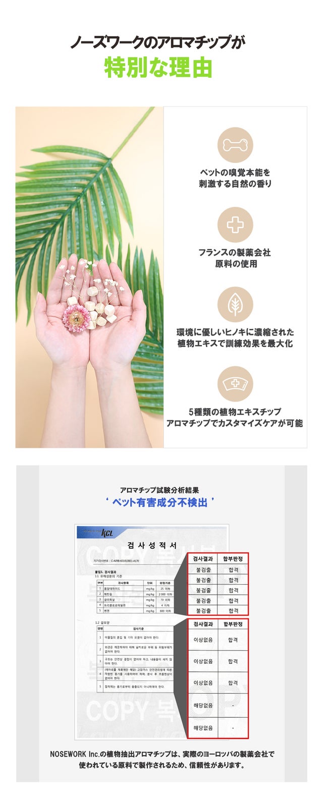 - ノーズワーク訓練中に自然に接せるアロマの香り、犬の好みに合った選択が可能