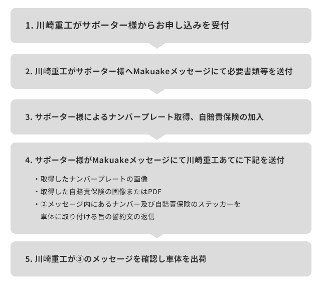 今回makuakeで販売する車両は本格市場導入前のテスト販売仕様で、言うならば、「購入頂いた方とKawasakiで“一緒に新しいコンセプト/構造の乗り物を創り上げるプロジェクト!”」。正直なところ生産の中で一部仕様が変更となる可能性もあり、また想定外の事象が発生してしまう事もあるかも…。そんな時は開発チームにすぐフィードバックをください!あなたの声を車両開発にすぐに反映させて頂き製品をどんどんバージョンアップ!このように、今回のテスト販売は多くの人に実際に使って頂く中で「一緒に新しい乗り物を創り上げるプロジェクト」です。このような趣旨に賛同頂ける方、またご購入後使用経過の中でアンケートにご協力頂ける方に、是非ご購入をお願いします。