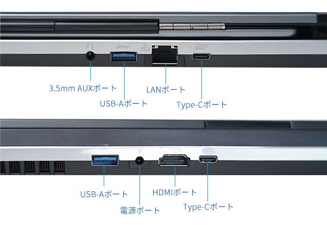 通常のノートPCよりも多くのインターフェースを搭載。2つのType-Cポート、2つのUSB-Aポート、HDMIポート、LANポート、電源ポート、3.5mm AUXポートによりハードディスク、プリンター、プロジェクター等との接続が可能で、柔軟な入出力と拡張性を備えています。