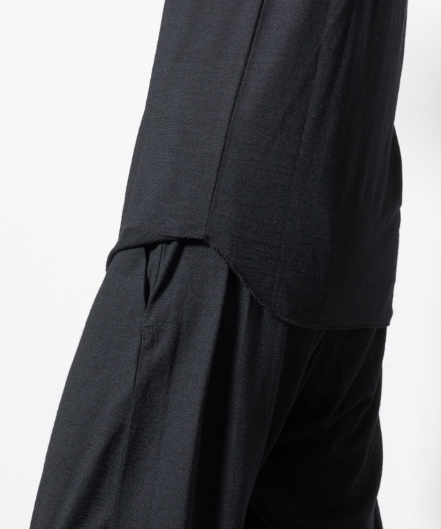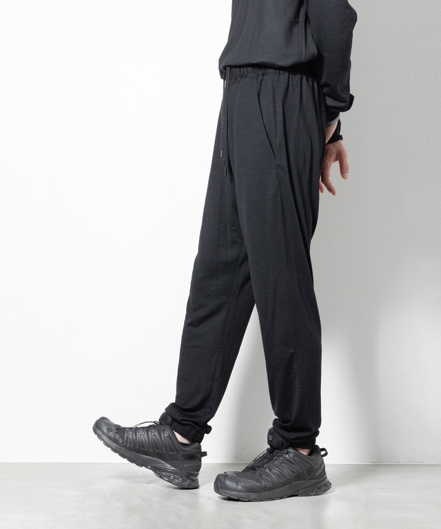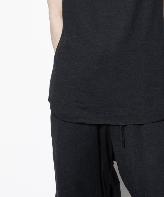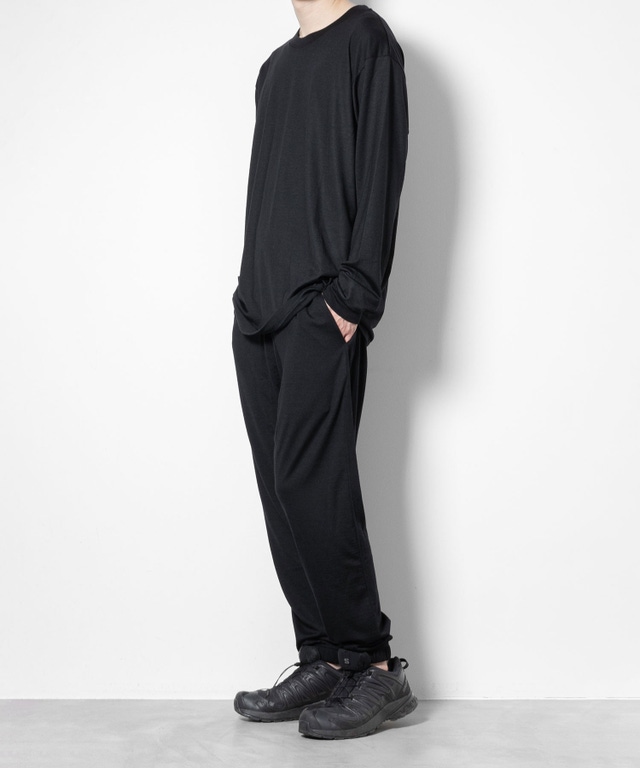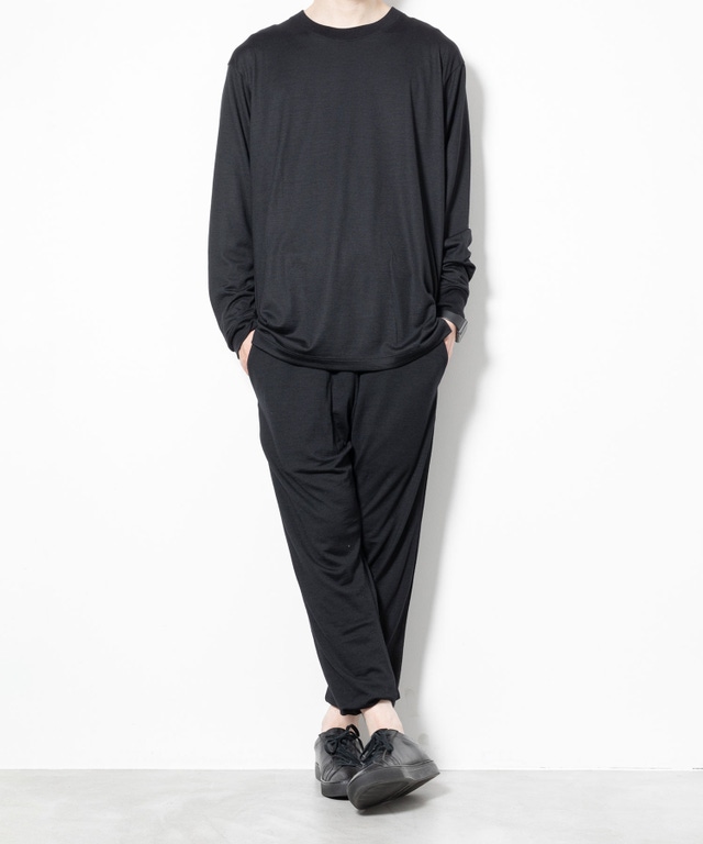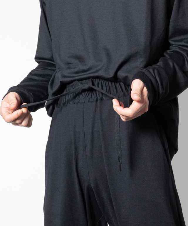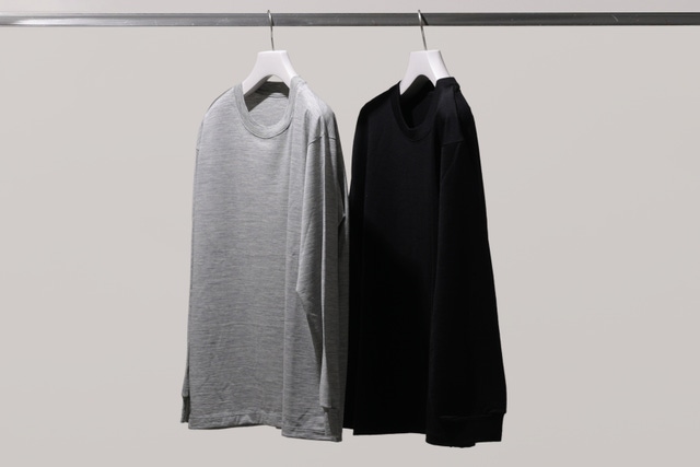 オーストラリア産super100’s Woolの高級糸を使用し、イギリスのハダースフィールド、イタリアのビエラ、と共に世界三大毛織物産地と言われる、日本のウール産地である尾州で編み立て、染色された素材を使用し、「長袖Tシャツ」「タンクトップ」「パンツ」の3点セットアップを作成しました。