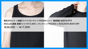 Makuake価格 長袖Tシャツ¥15,400 + タンクトップ¥8,800 = ¥24,200の 約30%OFF